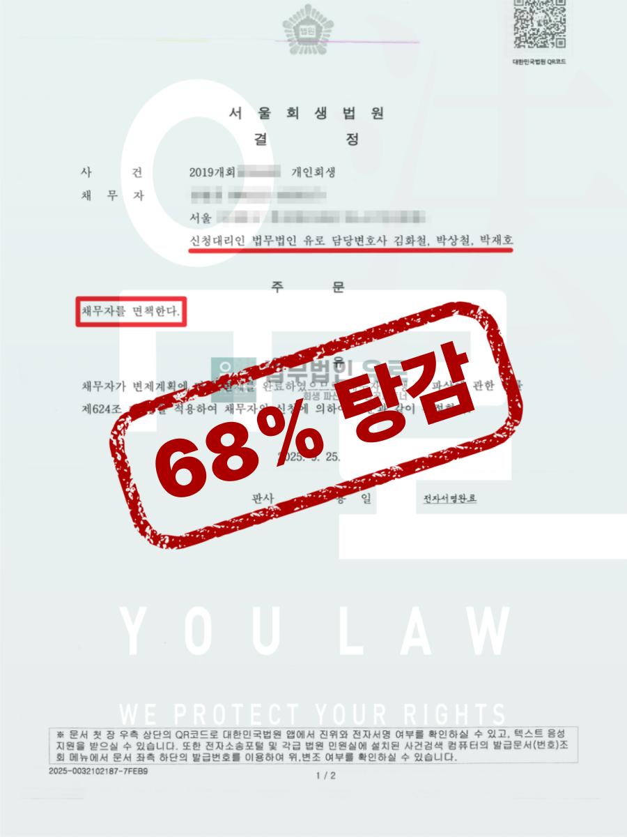 - 채권자 6곳 총 채권액 1억 6천여 만원 중 3년간 6,200여 만원만 변제하고 68% 탕감받는 것으로 개시결정.