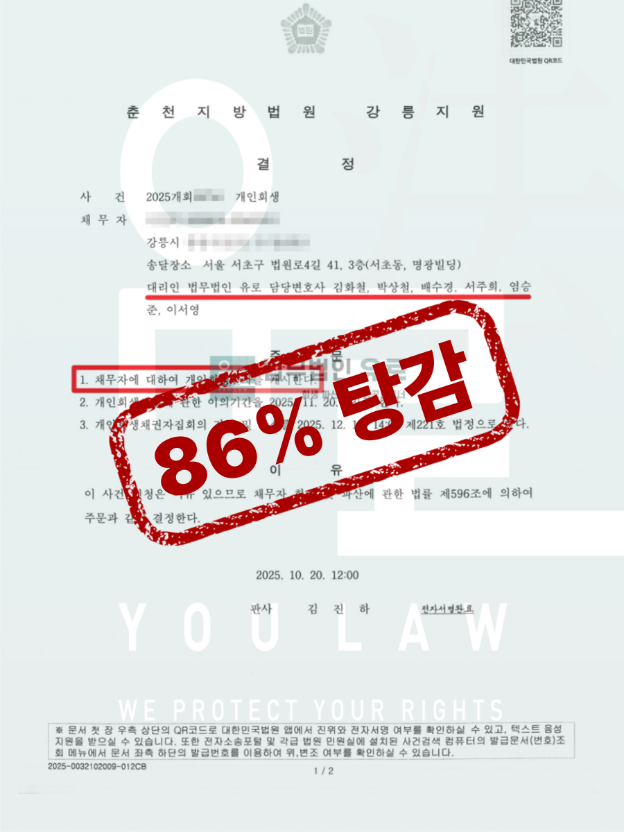 - 채권자 9곳 총 채권액 9천여 만원 중 3년간 1,500여 만원만 변제하고 86% 탕감받는 것으로 개시결정.